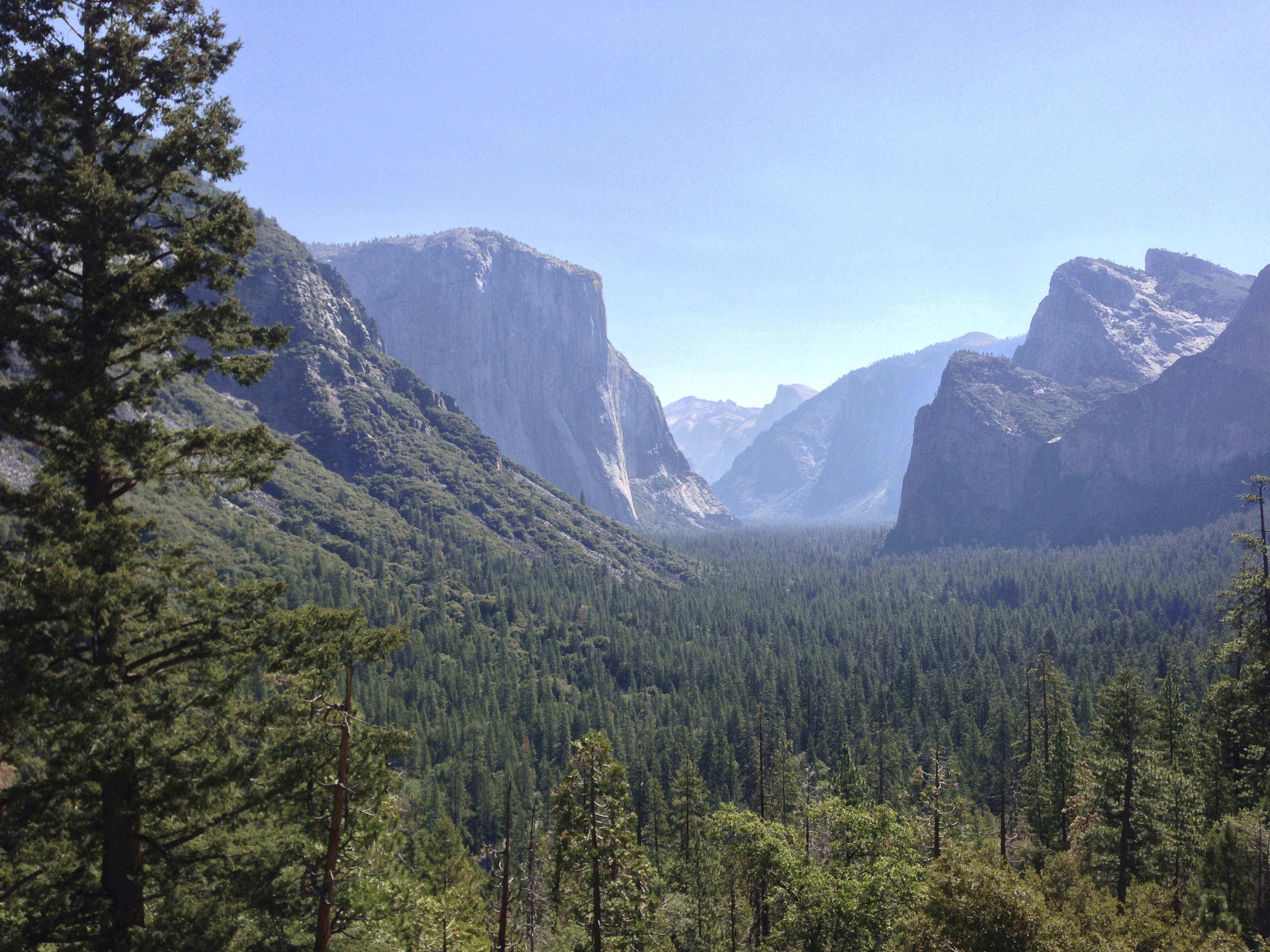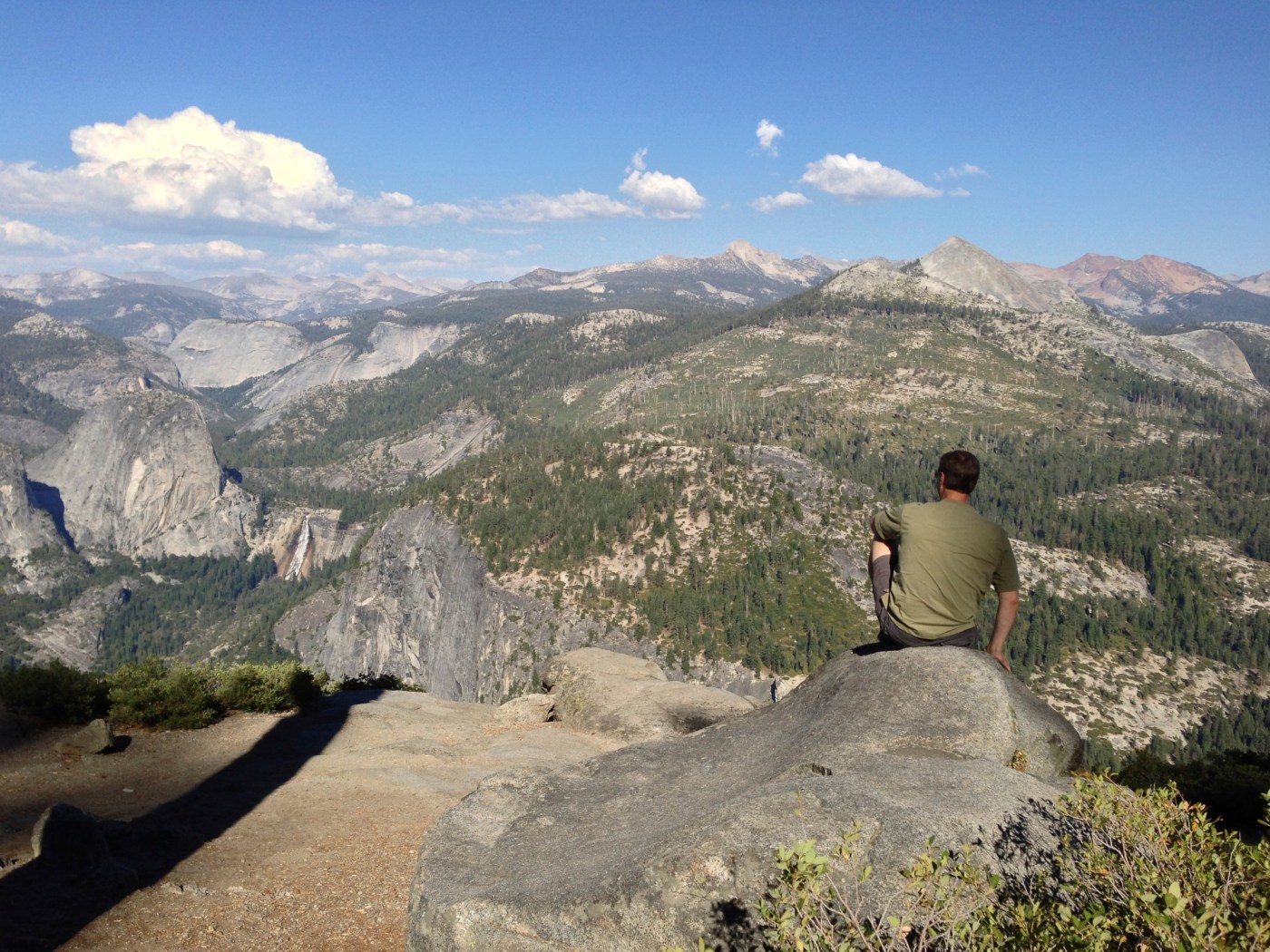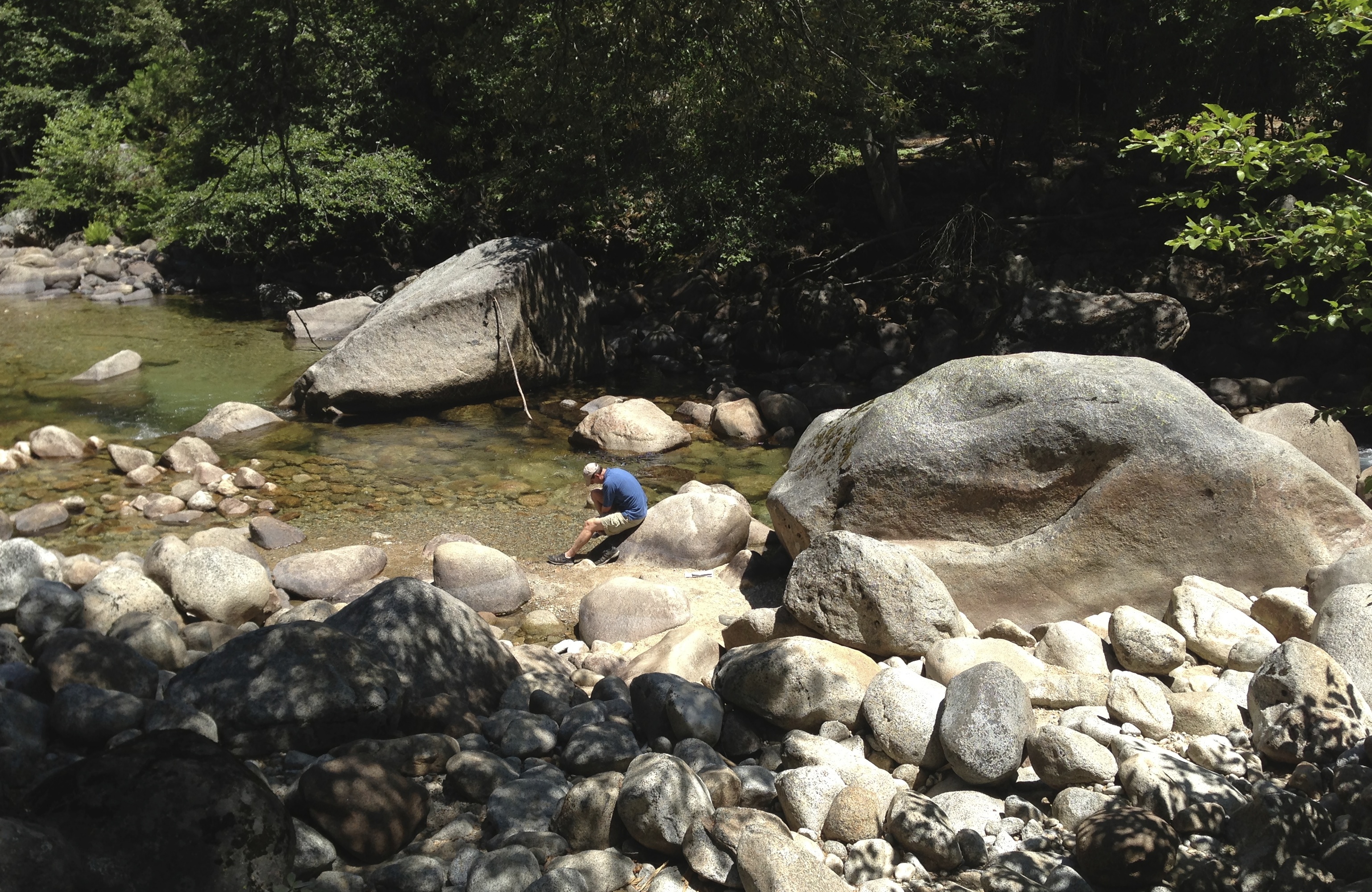 Al by the river at Happy IslesThe next day we visited Glacier point and it’s terrific views of the valley, and also the Mariposa Grove, home to the Giant Sequoias. At Glacier point, we also saw a black bear (even though it’s brown) foraging for food. He walked slowly, turning over branches and rocks, looking for bugs, I guess. He didn’t seem to notice us. unfortunately, both my photos were blurry as I took it while the vehicle was moving.