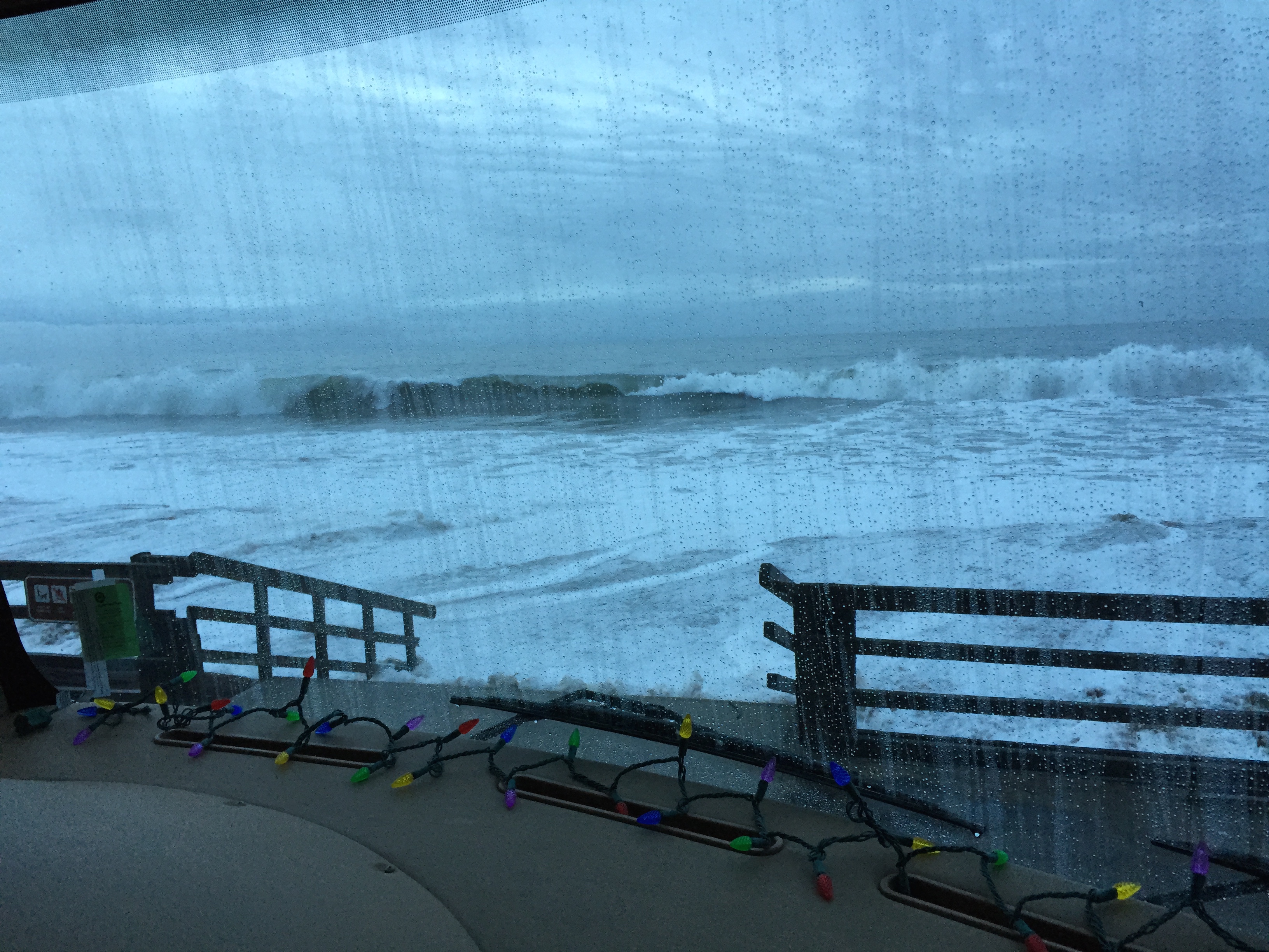 During the night, it seemed like the waves were louder than usual, and when I woke up in the morning, the waves that are usually about 50 yards from the RV were lapping at the walkway about 10 feet from the coach!
