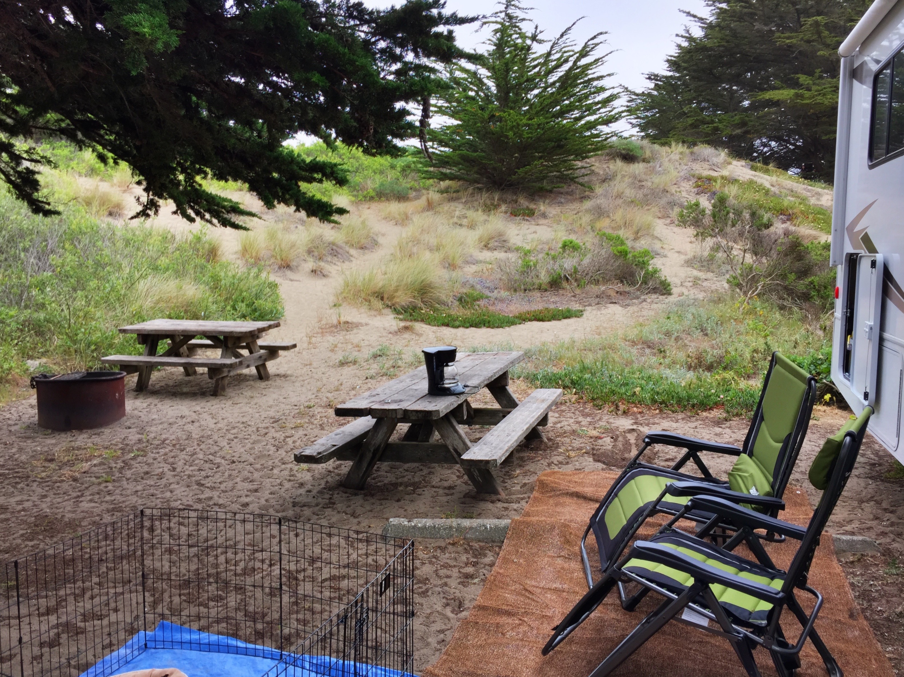 We found a great campsite at Bodega Dunes, with a forest of Cyprus trees on one side and the sandy dunes on the other, about a half mile walk to the ocean.