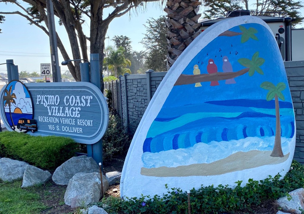 While we in CA are in lockdown again, it was fun to revisit our trip to Pismo Beach a few weeks earlier. We stayed at the Pismo Coast Village, a really nice park with convenient access to the beach and town of Pismo Beach. This sign is repainted for each season. 🙂