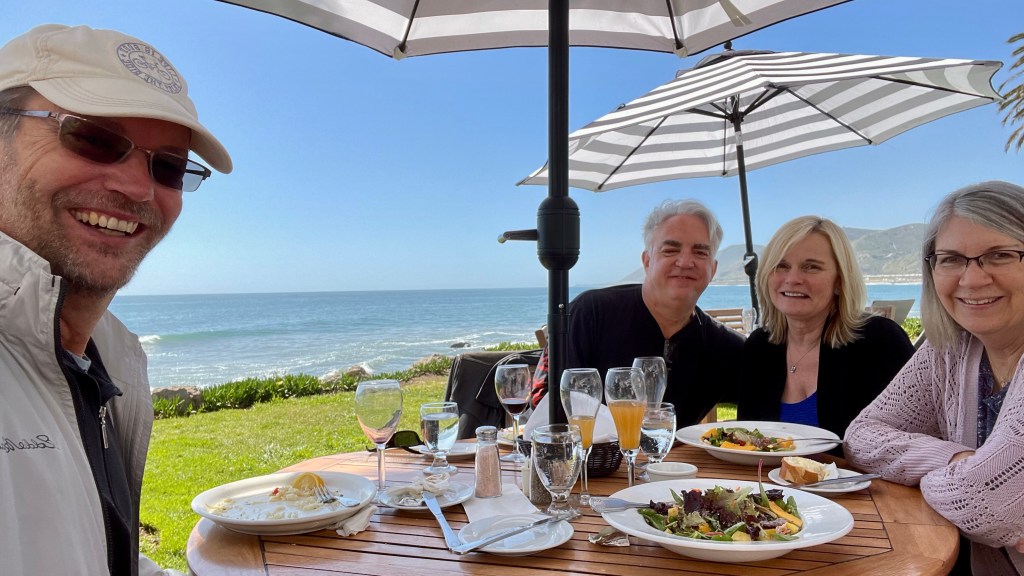 We did get a photo of our visit with Scott and Bev. They introduced us to a nearby restaurant at the Cliff House Inn. They have a beautiful outdoor seating area right on the ocean. With perfect weather that day, it reminded us of Hawaii!