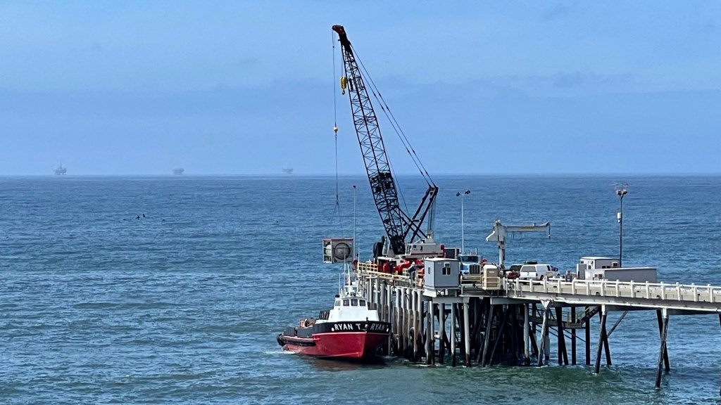 Here they are loading some heavy equipment onto the boat.