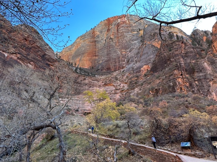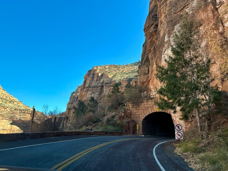 The hour drive from St. George is beautiful, slowly revealing what’s in store as you enter the canyon. Here is the entrance sign at the bottom of the canyon. There was a small backup at the entrance when we visited, after Thanksgiving. The shuttle system had just ended for the season, so we could explore the canyon in our own vehicle.