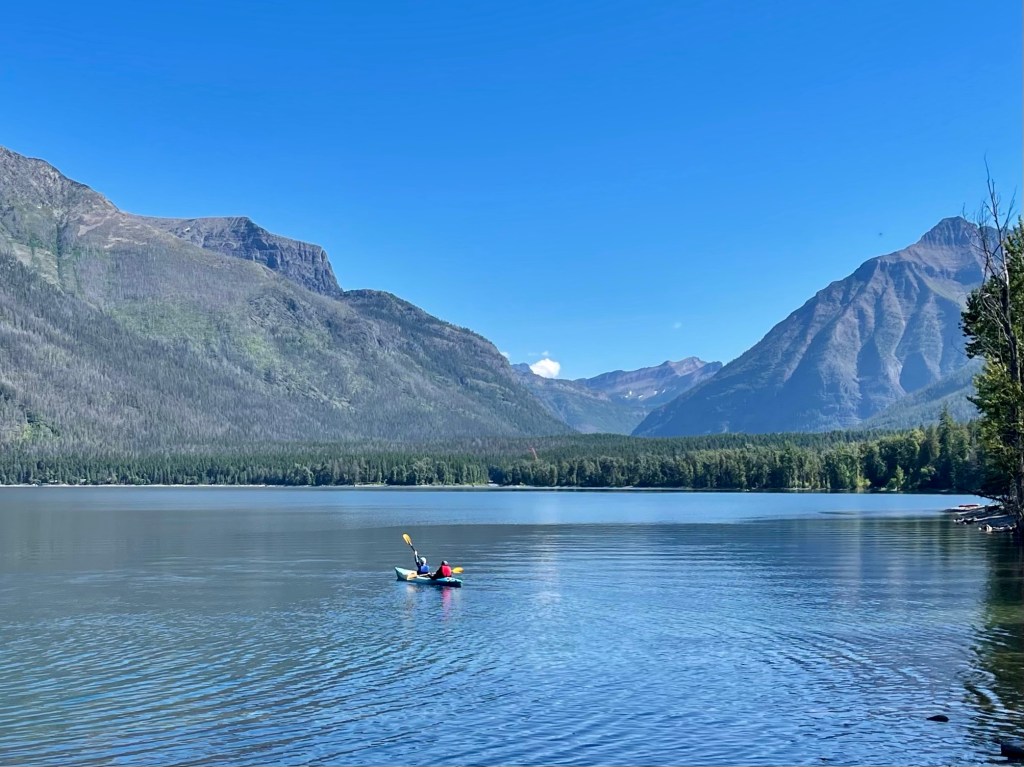 Apgar has the visitor center, which is always crowded, a campground, and a little village where you can eat, get supplies, or rent a kayak.