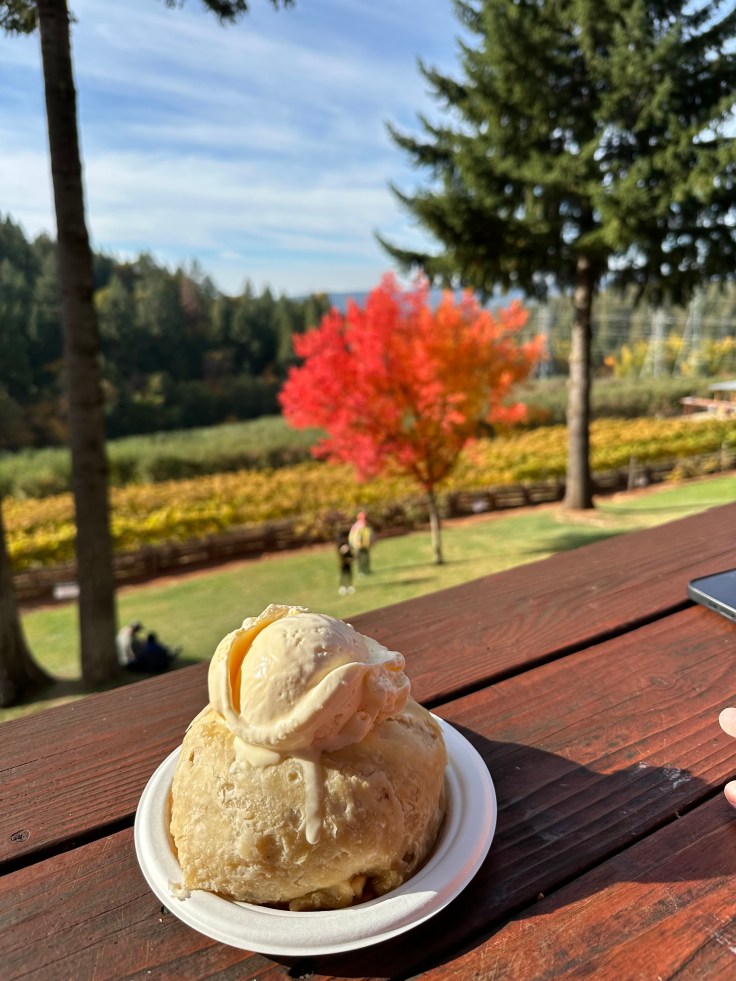 Here we are enjoying a small “hand pie” at Delfino Apple Farm.
