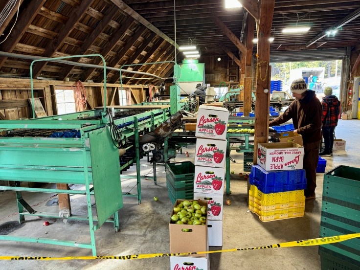You can see the apples in the trees being harvested, processed, ….