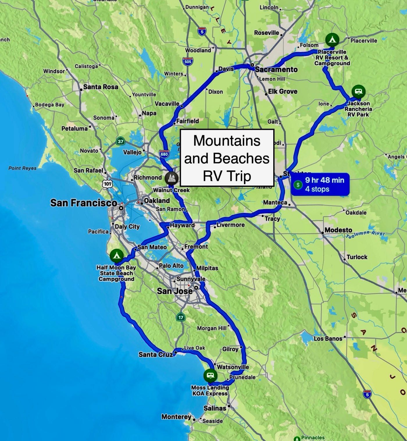 Our first destination was Half Moon Bay State Beach Campground. This is one of our favorite places to visit for the ocean front camping, beautiful beaches, miles of bike trails, the quaint downtown, and the marina and restaurants just a couple miles away.