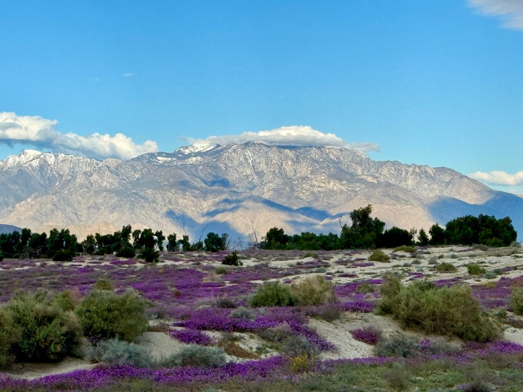 The cool and rainy weather followed us here, but I’d rather have that than unseasonable hot weather. Besides, it made for beautiful landscapes…here is San Jacinto Mountain in back of sand dunes filled with the purple flowers.