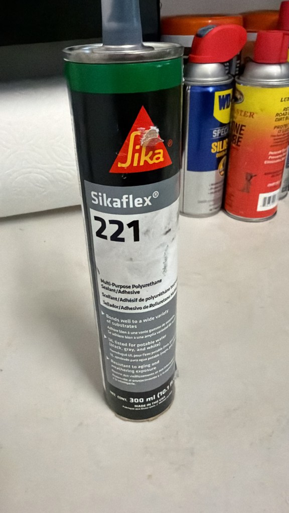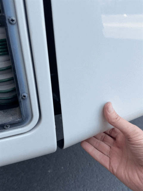 The metal exterior started pulling away from the drivers side rear compartment door. One repair shop said it would cost over $4,000 to repair it. Yikes! Fortunately, NIRVC in Phoenix suggested I clean the area and use SikaFlex (the same product Newmar Used) to glue it back on. It has held tight since then and I appreciate NIRVC for saving me $4,000, less $20 for the tube of SikaFlex they sold me. 🙂