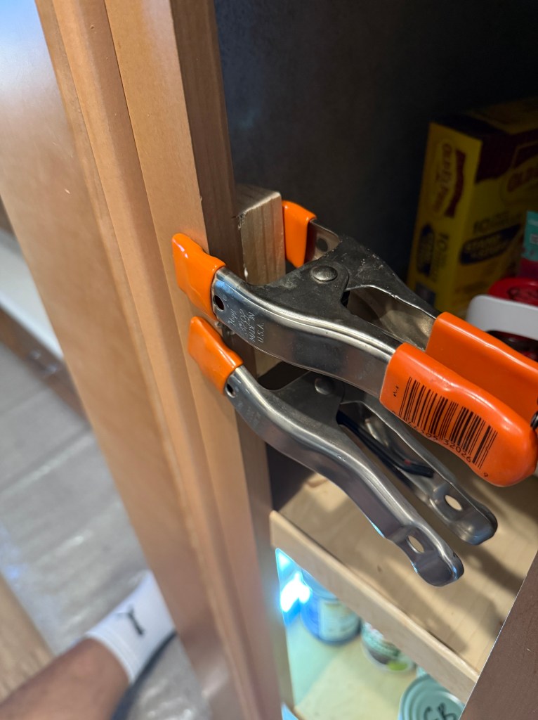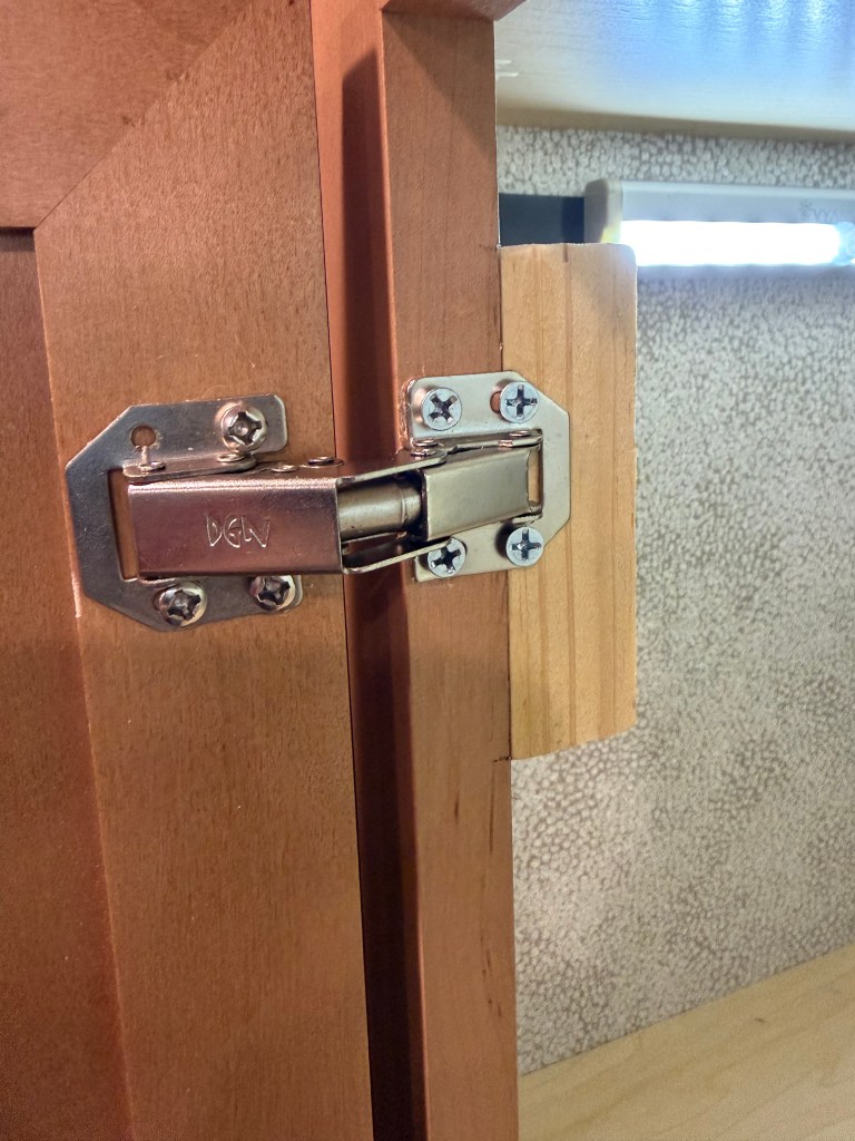 All Newmar owners understand that you may need to fix a cabinet door screw using the toothpick and Elmers wood glue method. That’s worked well in a few places. However, our pantry door was very different. Newmar used the wrong hardware for the job. As you can see, the hardware has 4 holes for the screws, but the thickness of the stile only allowed the use of the front holes. This meant that every time the door opened the hardware would flex a little. Over time the metal fatigued and broke in two. My solution was to add wood to the inside of the cabinet stile so that all 4 holes in the cabinet hardware could be used. My friend (thanks again Phil!) helped me with the project and it came out great. The door is finally very sturdy and will last as long as the RV.